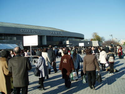 | 大阪城ホール入り口に行く途中で掲示された案内看板 | 続々と1万人合唱団員が駆けつける大阪城ホール前 | ||