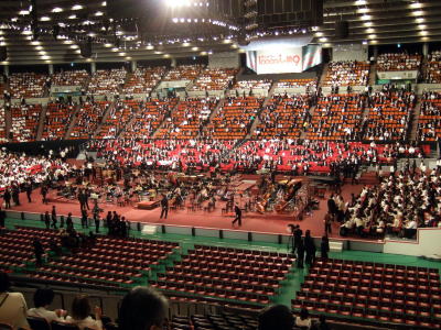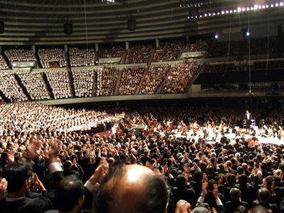 今年も歌ったぜ♪ 大阪冬の風物詩 歓喜(フロイデ)の第九 今年のテーマも「歌のある星へ」 歌いきった爽快感や充実感は最高! 2年前、井藤正治会員のお誘いで、LSC関西に初めて結成された「一万人の第九を歌う会」の参加者は7名。 鳥肌の立つ感動を共有した仲間が、他の仲間を誘い合って昨年は11名が参加。 そして、今年は東京から井森晴彦会員が仲間に入り15名(初心者4名)で「フロイデ(歓喜)」を歌いきりました。 8月下旬から京阪神と東京の各会場で約500人単位で合唱指導(初心者は12回、経験者は6回)が行われた。 めったにカラオケも行かない私(天野)にとって、テノールの高音は非日常的、最初のうちは声が出ず「堪忍して欲しい」という心境でいた。ましてソプラノさんの高い音は、まるでニワトリを絞め殺したような悲痛な声に聞こえたのは私だけでしょうか? ベートーヴェンさんはこんな過酷な、神に近づく「声(楽器)」を求めていたのでしょうか。 そんな楽しい(時には酷な・・)レッスンも1〜2回欠席すると、本番に出れない。従ってこの期間は暴飲暴食を自重し、仙人か聖人のような生活をしました !?(メタボ解消にもってこい!) こんな人たちが、ある日リハ〜サルの2時間と翌日の公演本番に一万人が集まり、指揮者の佐渡裕さんのタクトで一糸乱れづ歌いきるって信じれますか? それが、出来たのです。だから歌いきった瞬間出演者の誰かが思わず“ブラボー!”と叫び、その瞬間みんなが(少なくとも私は)目頭を熱くし、鳥肌のたつ感動を味わいます。 そして、その日しか遭わなかった前後左右の歌う仲間とそれぞれが握手しあい、感動を共有するのです。 本番前の会場の様子 アリーナ式体育館である大阪城ホールでのクラシックコンサートはもともと不向きだったようです。それは残響時間に問題があります。スタンドの後ろのほうから見る指揮者は米粒のようにしか見えない。 だからついつい両サイドにある大きなスクリーンに映されている指揮者のタクトを見て歌ってします。 そうすると、間違いなく音が2〜3秒ずれて聞こえてしまいます。加えて巨大空間の中では、オーケストラと合唱団との距離の遠近により、客席にはバラバラに音が届いてしまうこともあります。 そこで毎日放送社の音響技術陣が、電気的音響技術を駆使して(スピーカーから発する音が人の耳に影響に及ぼす際の「ハース効果」を応用したそうである)、巨大空間にあってもクラシック音楽の演奏にふさわしい音環境に極力近づけるべく努力した結果、今日の大合唱が可能になったようです。 佐渡裕さんから “今年はワイルドでいくぞ〜”と指導されました。音を合わすのも大事だが、もっと大切なのは1万人が心を一つにして思いっきり羽ばたく声を出そうと皆が頑張ったお陰で素晴らしい「合唱」になりました。