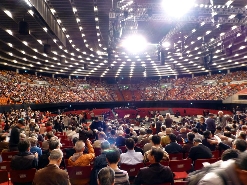 | 抽選という厳しい難関(数人が落選とのこと)を突破して今年もLSC会員10名が大阪城ホールに集いました。昨年30回という節目の年を過ぎ、今年は第31回です。新たな気持ちで迎えようと、これまで続いていたやり方を3つ変えたとの説明がありました。 まず、大きく変わったのが会場のレイアウトです。楕円形の会場が縦、横反対のレイアウトになりました。楕円の長い方を利用してアリーナ席、舞台、客席と並びます。佐渡さんがより高い音楽性を追求するために決断したそうですが、やはり心配で駄目なら来年元に戻すことも考えていたそうです。前日のリハーサルで通した後の感想が、「やはりこちらの方がよい」とのことでした。ただ難点は舞台後方のアリーナ席にはテノール、バスが陣取りますが、指揮者が非常に見にくいことです。背の小さな方はほとんど指揮が見えなかったそうです。来年以降もこれレイアウトなら改善を望む声が大きかったです。 会場の写真撮影は一切禁止ですが、今年は前日のリハーサルの開場からリハーサル開始までの15分程度写真撮影が許されました。おおよそ会場のレイアウトがわかると思います。この位置から全員が立ち上がるとほとんど指揮者は見えなくなります。 |
