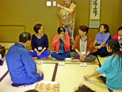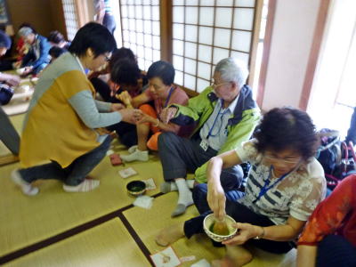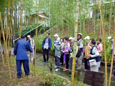 | LSCと交流のため来日した台湾銀髪族協会ご一行を奈良公園などの案内観光 文:神原克收 写真:中川廣次 2日目は「日本のお茶文化を体験」をテーマに奈良県生駒市の竹林園にご案内。台風の影響による雨も途中から止み、絶好の観光日和となった。 竹林園では日本の茶筅王中田氏の案内で茶筅の種類や出来るまでの工程を懇切に説明。 その後茶室に移動し抹茶点て体験。最初に裏千家師範(中田氏夫人)の模範演技を見せて頂き、全員で各自抹茶を点てて賞味した。 中には正座をする人もいたが大半の人は胡坐を組んだり、足を投げ出したりして各々のスタイルで抹茶を楽しんでもらった。台湾では現在抹茶ブームではあるが、どこまで判っているのか不明ながら「美味しい、素晴らしい」のお世辞連発で、我々お世話役の労を労ってくれた。 殆どの人が初めての抹茶点て体験で、侘び寂びとは程遠い雰囲気ながら「普通のツアでは絶対に経験出来ない」と大変喜んでくれた。