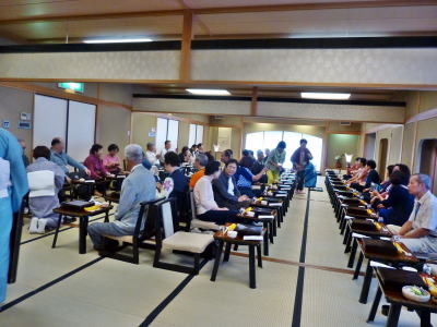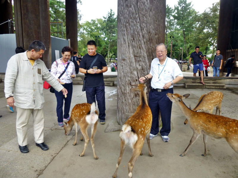昼食は伝統的な日本料理店で本格的な和食を提供。ここでも本格的な日本料理は初めてと喜ぶ人が多かった。 昼食後は東大寺へ移動し、大仏さん見学後全員が鹿にセンベイを与えて、鹿との触れ合いを楽しんで頂いた。中には鹿に纏いつかれてセンベイを投げ出して逃れる人もいて、笑いの中にも「鹿との交流」を満喫してもらった。 東大寺到着時奈良県観光課の課長が奈良日日新聞社長と一緒に挨拶に訪れ、歓迎挨拶をしてくれた。これは東大寺に中国語のパンフレットがないため奈良日日新聞社長の尽力で急遽作ってもらい、出来上がりホヤホヤのものを運んできてくれた際の出来事であった。 ありきたりの観光コースは台湾の方々は結構行っているため、今回のような体験型の観光が喜ばれたと思う。 |