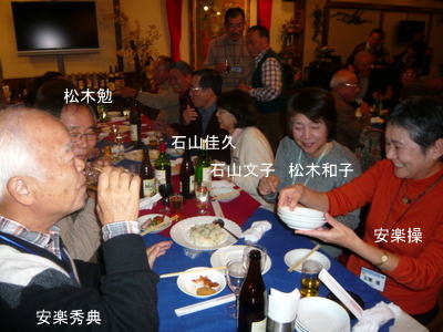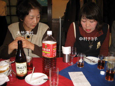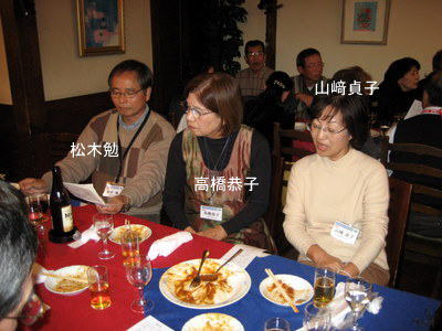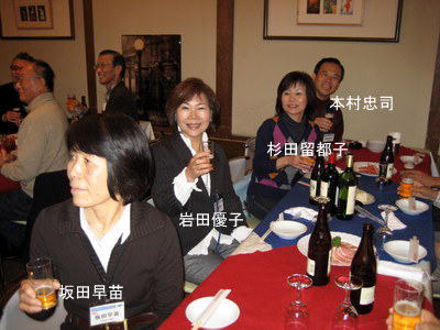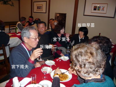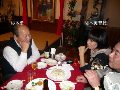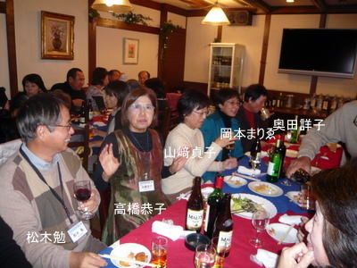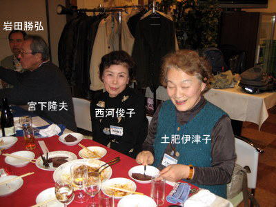 | 今度一緒にホームページ作成の勉強をしましょうと西河さんに話しかける宮下さん。(西河さんの顔が見えませんが、黒い髪の方。) | まあまあ、ワイン飲みね、スパゲッティー食いねと、坂本さんにすすめる谷和さん | |