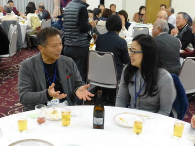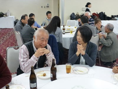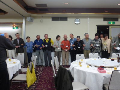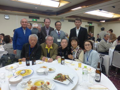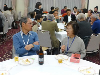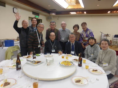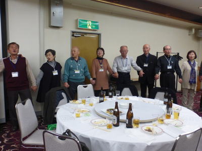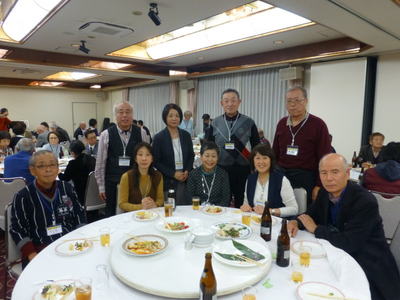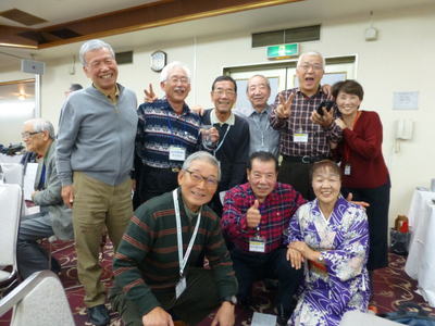 | 懇談会に続き、同じく大阪リバーサイドホテルで懇親会が開催されました。参加者は、88名でこちらも満席状態。大人数でパワーが会場全体に広がり、大盛況であったことは言うまでもありません。 堀口昌之介さんの司会進行で、まず大島英子さんの乾杯の音頭からスタートしました。 今回は、アトラクションとして、最近入会された遠藤敏文さんがマジックを披露下さいました。ケイオンズの演奏はいつも通りで、ダンス同好会もコラボで社交ダンスを踊り、いつもと違ったのは、みんなで肩を組んで歌う唄が、今までが「青い山脈」「高校三年生」だったのが、「青い山脈」「上を向いて歩こう」変わったことです。 最後の中締めは、安楽さんが、馬力のある大声で、別誂えの法被を着ての三三七拍子で迫力満点の、まさに今年のLSC関西の隆盛を示すが如くの見事な締めでした。 **集合写真の敬称は略させて頂きますのでご了解願います。 |