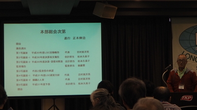 | 111名の会員および体験参加者が集いました | 本部総務担当の正木が本部総会の議長として進行 | ||