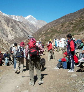 ネパールでは、“雪線を越える6000m以上のピークを征服することを登山、 それ以下の山々を歩くことをトレッキングと区別する。5000m〜6000mの山々には名前さえついていない。万年雪から豪快に水しぶきを上げて流れ落ちる数々の滝にも名は無い。4000m地点を歩きながら、見上げるあの山は、”一体どのくらいの高さ?5000m?7000m位かな“など・・・と、日本の山々とはスケールが大きく違い戸惑うことも多い。