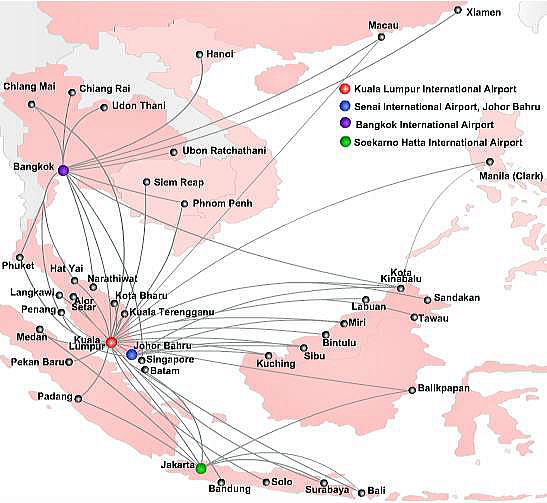 | マレーシアにはエアアジアという格安航空会社があり、ここを起点にマレーシア国内はもとよりアジア各国に大変安く行ける。行き先も下図のようにアジアの主要な都市には飛んでいて、近年急速に就航都市を増やしている。 |