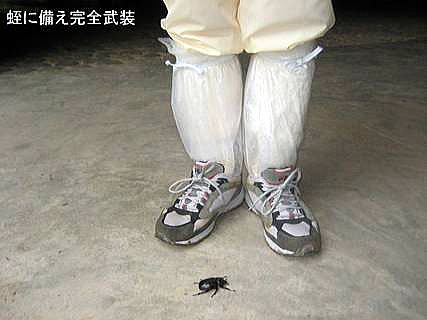 写真に見るように重装備で蛭防止を図る。首にはタオルを巻き、頭には当然帽子を被る。それでもどこからともなく食いついてくるので油断出来ない。徹底警戒のお陰で大した被害もなかったが、同行したA氏夫人が蛭の侵入に気がつかず、ホテルに帰ってシャワー中に気が付いた。その時には蛭はタップリと血を吸い、丸々と太っていたとのこと。