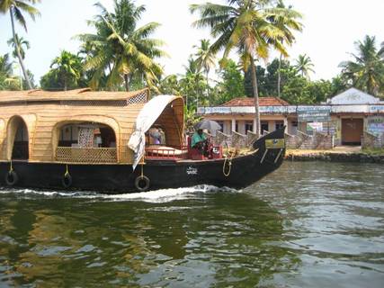| インド最南端西部にケーララ州がある。アラビア海に面したコーチンと130Km南のクイロンまでの一帯は水郷地帯が拡がっている。その中心をなすのがアレッピーの街である。 この水郷地帯(バックウオーター)は総延長数千Kmに亘って運河で繋がっていて、重要な交通手段になっている。この運河は人間が作ったのではないかと思うくらいよく整備されているが、実際は天然に出来た水路だという。 この水路が生活に深く関わっているのは当然として、現在では重要な観光資源になっている。写真に見るようなハウスボートで日帰りから数日、1週間の旅が用意されている。涼しい川風に吹かれ、鬱蒼とした森の中に繰広げられる美しい景色と運河沿いの人々の生活を垣間見ながらの旅は快適そのものである。 因みにハウスボートを借り切っての旅の値段は2泊3日・エアコン付・全食事付で 2人なら$356,3人で借りると$444、4人で$533とのこと。高くはない。 |