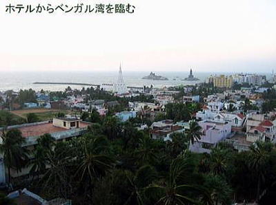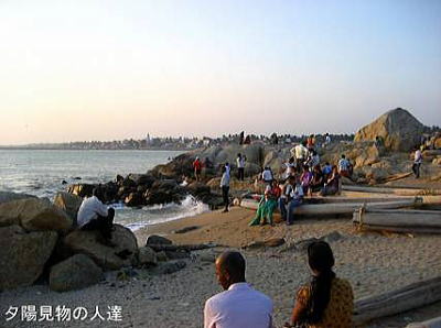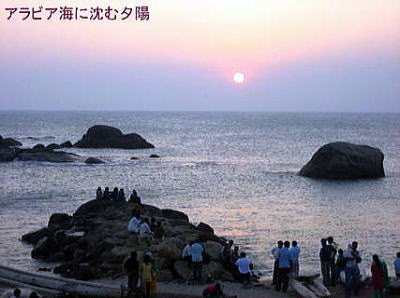インドの最南端はカニャクマリという小さな町で、その最先端がコモリン岬である。ここからベンガル湾、インド洋、アラビア海の3つの大海を同時に見渡せる。インド洋を挟んでアラビア海に沈む夕陽を眺め、ベンガル湾からの朝陽を拝むことが出来る。 ここはヒンドゥ教徒の聖地の一つで、夕陽を眺めにどこからともなく人が集まるが、ベナレスのような人の洪水は見られない。 ここのホテルで日本の観光ツア一行に出逢ったが、彼らは夕陽だけを見るため5時間もバスに揺られて来て、翌朝は早々に次の目的地に出発するとのこと。 どこで見る夕陽も美しさに変りはないのだが、最南端、最北端など「最」が付かないとブランドとしての値打ちが出ないのだろう。やはり鶏口となるも牛後ではだめということか。それにしても夕陽だけのために往復10時間も掛けて来るとは、旅行社も罪なツアを考えたものではある。 (我々はそんな強行軍ではありません、念のため) |