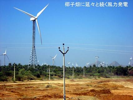 インド最南端の町カニャクマリ近郊で沢山の風力発電設備を見掛けた。 データは古いが2007年末現在世界では9400万KW(大型原発70基分相当)の風力発電をしている。 年率30%程度伸びているので、現在は2億KW近くになっているのではないかと思う。 最大はドイツ、次いでアメリカ、スペイン、インド、中国で日本は13位、ドイツの15分の1と大きく遅れを取っている。 カニャクマリ近郊には発電設備を制作している工場もあり、大きな部品を積んだトラックの往来が頻繁であった。 アジアではインドと中国が風力発電に力を入れているらしく、この分野でも日本が置いてけぼりを喰っているようで、正直寂しい気持ちになった。 |