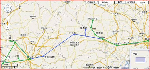 今回も櫻井氏呼び掛けのお誘い旅行で、この旅はいつものことながら通常の旅行では絶対に行かないところへ行くことが多い。 従って地元ガイドも行ったことがなく、櫻井氏はじめ中国通の参加者がガイドに教えることが多い。 ・参加者:北海道1人、東北1人、関東17人、中部1人、関西5人の25名。 ・日程:2010年6月22日〜7月6日 ・行き先 重慶〜大足〜自貢〜遂寧〜大英〜重慶・・・この間車で移動 重慶〜豊都(鬼城)〜白帝城〜神農架〜宣昌・・・この間三峡下りクルーズ 宣昌〜木魚〜神農架林区〜王昭君古里〜屈原祠〜宣昌〜刑州〜武漢 ・・・この間車で移動 武漢〜上海(万博)・・・寝台列車 ![]() ![]() グリーン線は車で移動、ブルー線は三峡クルーズ、武漢〜上海は夜行寝台列車 |
