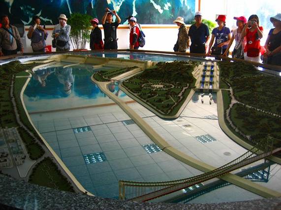 ![]() ダムの模型、写真上部が上流、右側階段状のものは船舶昇降装置 |