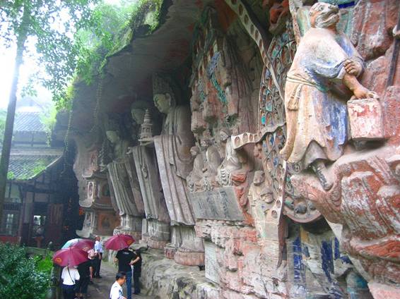 重慶の西12Kmに大足という町があり、その周辺に石窟が集中的に残されていて、世界遺産に登録されている。これらの石窟は9Cから13Cにかけて掘られたもので、殆どが仏教の石仏である。 特に有名なのは長さ31mもある涅槃仏。巨大すぎてとてもカメラには治まらない。その他の石窟もスケールの大きいものばかりだが、芸術音痴にはその有難味が理解し難い。ここは敦煌・莫高屈、洛陽・龍門石窟、大同雲崗石窟の3大石窟に次ぐ存在らしいが、今までに見た3大石窟やインドのエローラ・アジャンタと比べると迫力は今一つの感がある。 ではなぜこんな石窟を造ったのか?資料を調べてみると打ち続く戦乱終焉を願って掘り進めたとあるが、それだけの理由でこれだけのものを造るエネルギーになるのだろうか?どうにも納得がいかず、もやもやした気分で石窟を後にした。 |