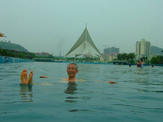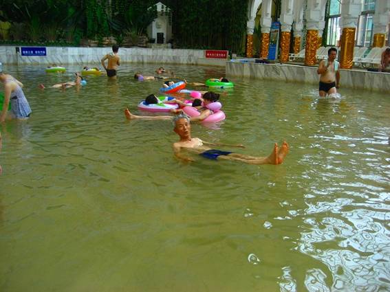 | 四川省に大英という人口55万人の小さいが有名な町がある。中国の死海と言われているからである。死海と言えばイスラエルとヨルダンに面した本家死海がある。通常の海水は塩分濃度3%、アラビアの死海は30%に対し、中国の死海は22〜25%程度とパンフには書いてある。 死海に入ってみたら確かに浮く。本家死海は行ったことはないが、長時間入っておられないと誰かに聞いたことがある。中国死海は何時間でも入っておれないことはない感じ(そんなに長時間入って面白いことは何もないが…)。以前アメリカのソルトレイクに入った経験があるが、そこよりは濃度は高いようだ。 ここは天然の池と言っているが、どう見ても人工的に造った池としか思えない。今世紀に入ってリゾート施設として開発が進み、ホテルをはじめ人工ビーチ、泥温泉、各種遊具施設を備えた巨大な遊園地と言った趣き。 それにしてもここの水は本当にきれいなのか?どこまで浄化しているのか?安心して長居するには少々勇気が要るように感じた。 |