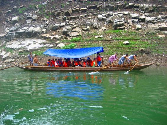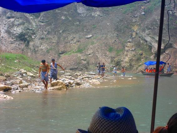 | 三峡下りの途中で下船観光を3回した。それ以外に下船ではないが、17人乗りの小さな船に乗り換えて支流の神農渓まで観光に出掛けた。 ここの水深がどれくらいかは不明だが、随分狭い山峡にまで入って行った。 驚いたのは景色もさることながら、小舟を操る5人の船頭達のスタミナである。船にはエンジンはなく、全て人力で、約1時間休みなく漕ぎっ ぱなしのスタミナには全く脱帽あるのみ。しかもその給料が僅か30元(400円)!つい、チップをあげたくなった。 余談ながら私も子供時代に経験があるが、日本では船を漕ぐとき、引く時に力を入れるが、中国では押す時に力を入れる。 鋸を挽く時でも日本は引く時に力を入れ、ヨーロッパでは押す時に力を入れる。多分鋸でも中国は押す時に力を入れるのだろう。 |