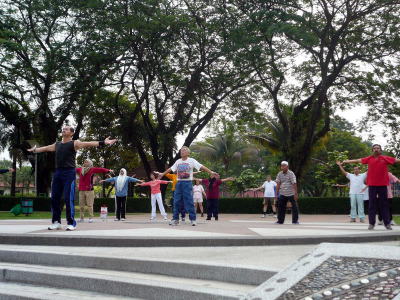 | エンコップ コンドミニアム前の公園で、毎朝7時すぎ頃から地元の人達がジョギング 又は散歩が始まります。 私は夜型タイプなので5回ほど散歩に行っただけなのに行った日は必ず中国の太極拳をされてるグループのリーダーが一緒にやりましょうと誘ってくれ、終了したら皆さんと握手をして別れます。 清々しく気持ちが良いですよ。 LSCのメンバーで、T.Sさんは7時からジョギング 〜 次は 機械での歩行 〜 プールでのスイミングが日課になり、お昼頃まで毎日、運動をされてました。 ![]() 公園の池の外周を散歩 公園に運動遊具が5箇所あり 又はジョギング ![]() 太極拳グループに入り、汗をかく エンコップ11階のスポーツジム 夜、プールサイドで飲み会もしたよ!(井藤 正治・友子 記)スポーツ ジム横のスイミングプール |