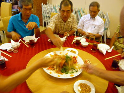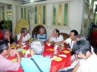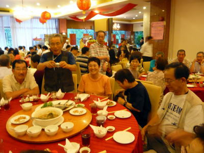 | その1. 2月9日 皆で中華料理 皆でホテルの中華レストランで食事した。 皆が宿泊するホテルのある駅からひとつだけ電車でいった駅前のアーマダホテルの一階にある中華レストラン。 土曜日だったせいかどうか知らないがほぼ満席で人気店のようだった。 神原、黄門(安樂)両夫妻は仲良く朝からマラッカへ小旅行に出かけたが夕方には間に合って全員参加の23名の大宴会となった。 2月4日にKLについて夕食を先発隊の歓迎を受けたときの夕食代は300円程度で驚いたものだ。 とにかく物価の安さに驚くばかりではあったが、たまには贅沢してみたいと「たまにはおいしい中華料理でも皆で楽しみましょうよ!」とお世話役の井藤さんに声をかけた。
