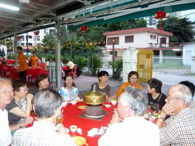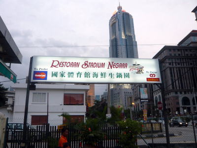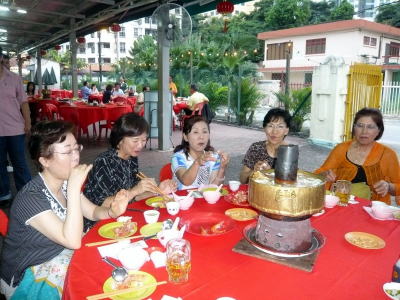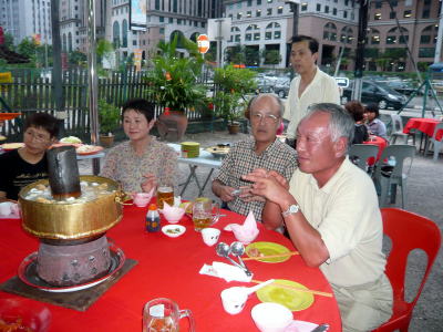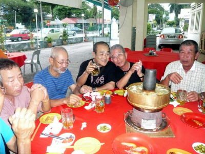 基本的にマレーシアは、イスラム教の国(もちろん多民族国家であり、その民族に従い仏教やヒンズー教もある。)なので豚肉は、あまりお目にかかれないが、この中華レストランの客は、ほとんど中国人なので豚肉料理はあった。しかし、残念なのは私の好きな酢豚、チャーシューなどなかったことだ。 ビールも日本とおなじくらいで少し高めだ。 それでもビールも飲んで騒いでしかもホテルにレストランで一人RM90とは、庶民のマレー料理と比べたら高いのであるが、日本で食べるのを考えると断然安い!驚くべき物価の安さ。 KLにはたくさんの素晴らしいところがある。 特に町の美しさ、治安の良さ、交通機関の発達、気候も暖かく過ごしやすい、さらにゴルフが安い・・などいろいろあってロングステイにはアジアで最適地と中西夫妻がはまるのがよくわかります。 いずれきっとLSを本格的にしたいと思っている。そのときの最有力候補地だ。 その2. 2月14日 大送別会 いよいよわがLSC関西のKLオープンに参加したメンバーの大半が明日帰国ということでその送別会があった。総勢22名が最後ということで集まった。 場所はKLCCからあるいて10分くらいのところにある中華スタジアムにあるネガラという鍋料理専門店だ。炭火でスチームボートというユニークな鍋に色々な具材を入れる。 なかなかの美味で日本人には好みの味だ。私はしゃべってばかりで皆のすばやい箸さばきにはついていけずかなり割り勘負けしたようだ。 割り勘負けしたといってもたいしたことはない。最後だと思ってビールを全員かなり飲んで料理も含め一人RM40ぐらいだったと思う。値段が驚くばかりの金額!これなら毎日宴会ができる。