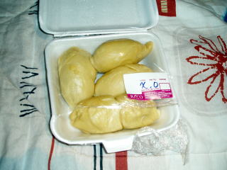 昨日ドリアンを購入して部屋で食べたものの、それが失態に繋がりました。 ドリアンは、強烈な臭いを放つ超個性的なフルーツです。 嗜好の違いにより、好き嫌いが大きく分かれます。好きな人の表現を借りれば果物の王様と呼ばれているようです。先にドリアンのことを書かれた杉本さんは、大好きのようです。 さて、僕の場合は、大嫌いの方になってしまいました。 何も知らない僕は、購入したドリアンを部屋に持って帰って食べたのです。味は、口に入れた瞬間、少しにがみを感じました。僕の持つフルーツのイメージである爽やかな口当たりと香りは全くありません。それほど甘みもなく、こってりした脂肪分とほのかな甘み程度。瞬間的な美味くないと感じてしまいました。。写真の通り5個入っていたが、3個食べた後、部屋に臭いが残ることを懸念をいだき、もったいないけれど捨ててしまいました。本当にもったいない。高級品質のものであったので35リンギットもしたものです。約1200円です。 部屋中にその強烈な臭いが充満。何だか都市ガスが漏れたような臭い。ちょとやそっとで抜けそうにもありません。後で、同部屋の人が帰ってきて、その異常臭にすぐに気が付かれました。平謝りに謝りました。 大変強烈な臭いとは聞いていたものの、これほどまでとは思っておりませんでした。 ホテルやコンドミニアムでは、ドリアンの持ち込みを禁止しているところがほとんどらしい。ドリアンは、屋外で食べるのがエチケットかもしれません。これも、旅先での初体験として思い出に残ることになると思います。 (正木伸治 記) |