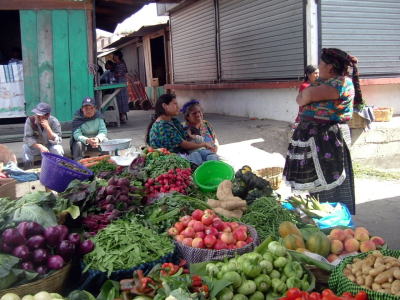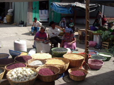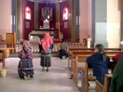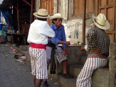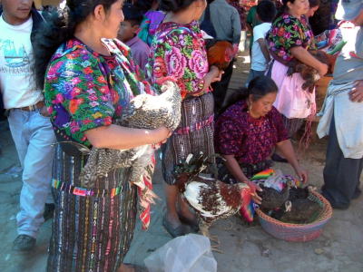グァテマラ最大の市場 パナハッチェルに一旦帰り、シャトルバスでチチカステナンゴへ。高度2000mの小さな町だが、木、金に開かれる市と、この町の守護聖人トマスが祭られるサント・トマス教会での儀式が有名だ。市場はグァテマラでは一番大規模で、民芸品や民族衣装の店の数も最高で、現地のインディオのにおいが満ち溢れている。教会の儀式はキリスト教と土俗宗教が合体しており、儀式自体はすでに終わっていたが、教会前で香を焚いた残り香やろうそくの煙などが充満しており、教会内もこれまでに見た内部とは趣を異にし、素朴な木彫りの人体像などがあり、珍しかったが撮影禁止だった。 ホテルは町中から少し離れた広大な庭を持つリゾート型のホテルで、部屋もゆったりしている。500m標高が上がると夜は寒く、暖炉を焚いたが朝方も寒く持参した寝袋に入って寝なければならなかった。 町から少し離れた丘の上に土俗信仰の地があるので行ってみたが、僧侶のような男性が男根を模した石の前に牛糞のようなもので作った饅頭を山に盛り、その上にチョコレート、パン、クッキー、蜂蜜などを乗せ、たくさんの蝋燭を立て火をつけて祈る。 伝統を重んじる宗教儀式のようで、横に見習いのような若い男性が立って一生懸命メモを取ったり、祈りの言葉の読み方を勉強している。 何の意味か分からないが、宗教はどこでも同じようなことをするものだと思いつつ眺めた。