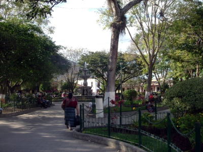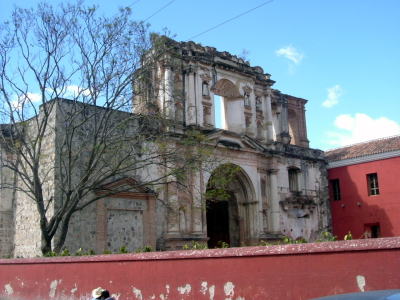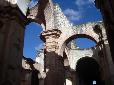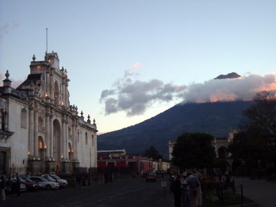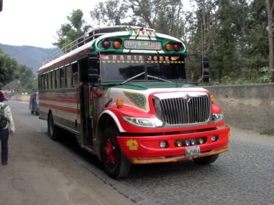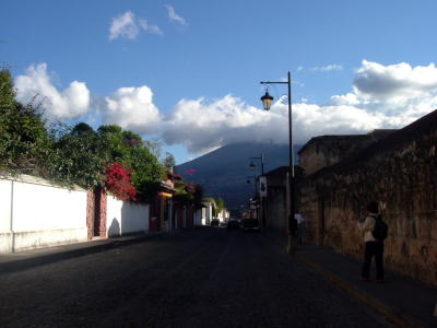 グァテマラのバス タクシーでアンティグアに向かった。180Q(ケツァール グァテマラの通貨)、約3000円でグァテマラの物価としては決して安くない。しかしあまりにも治安の悪さを強調されたので、通常のバスや観光地をつないでいるシャトルバスに乗るのが怖くてタクシーにしたのだが、グァテマラシティ以外ではそれ程治安は悪くなく、その後の観光はシャトルバスで十分だった。アンティグアも標高1500mに位置し、以前の首都だった町だ。3つの火山に囲まれ、これまで3度の大地震で美しい町並みが甚大な被害を受けたが1979年に世界遺産に登録後、目下街全体が修復中といったところだ。 かっては中米で最も美しい都市といわれ、人口も6万人を擁したそうだが、世界遺産に指定された後はグァテマラ国内で最も観光客が集まる街として再び脚光を浴びている。 泊まったホテルは築200年以上の歴史があり、中庭の噴水を中心に花々が咲き乱れ、静かで落ち着ける。久しぶりにおいしいカフェコンラチェを飲んだ。