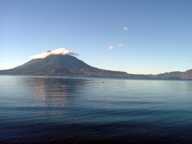 ![]() アティトラン湖 シャトルバスでパナッハチェルへ。この町もやはり1500mにあるアティトラカン湖に面した小さいが美しい町だ。湖の反対側にはサン・ペドロ、トリマン、アティトランという3つの火山がまるで富士山のような美しい稜線を見せ、湖にはそれが逆さ富士となって映っている。湖の周辺にはいくつかの先住民の村があり、それぞれの村で特色あるウィピルが織られている。 気候もよく、治安もよく手工芸品が多くあるこの町は私にとってとても魅力的な町だった。 街中にはおしゃれな店やレストラン、カフェが並び、アメリカ人の移住者も多く、彼らにとっても暮らしやすい町なのだろうが、先住民を見下した態度をとる人も多いらしく、現地の人からはかなり嫌われているようだった。